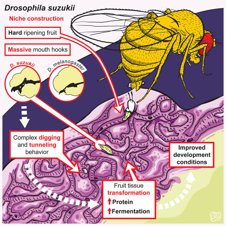 An illustration for a scientific presentation. It introduces the different habitats and feeding sources for different Drosophila species.